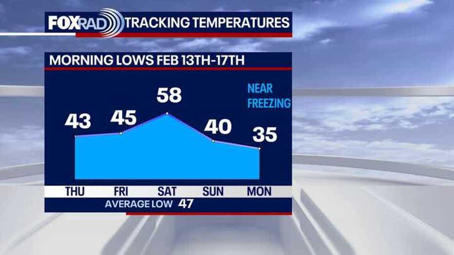 Lows tonight will drop into the 40s along with increasing breezes. Bundle up for a windy, chilly Thursday with highs in the 50s and gusts near 20 mph. Valentine’s Day looks decent, but not great. Expect a partly sunny sky, isolated rain and highs near 60.